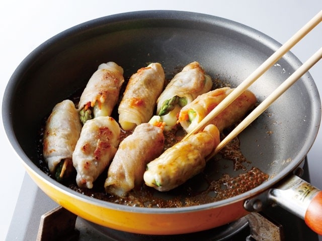 Heat the oil in a pan. Cook (2) with seam-side down. Once both sides are browned, cover and steam on low-medium heat for about 5 minutes.